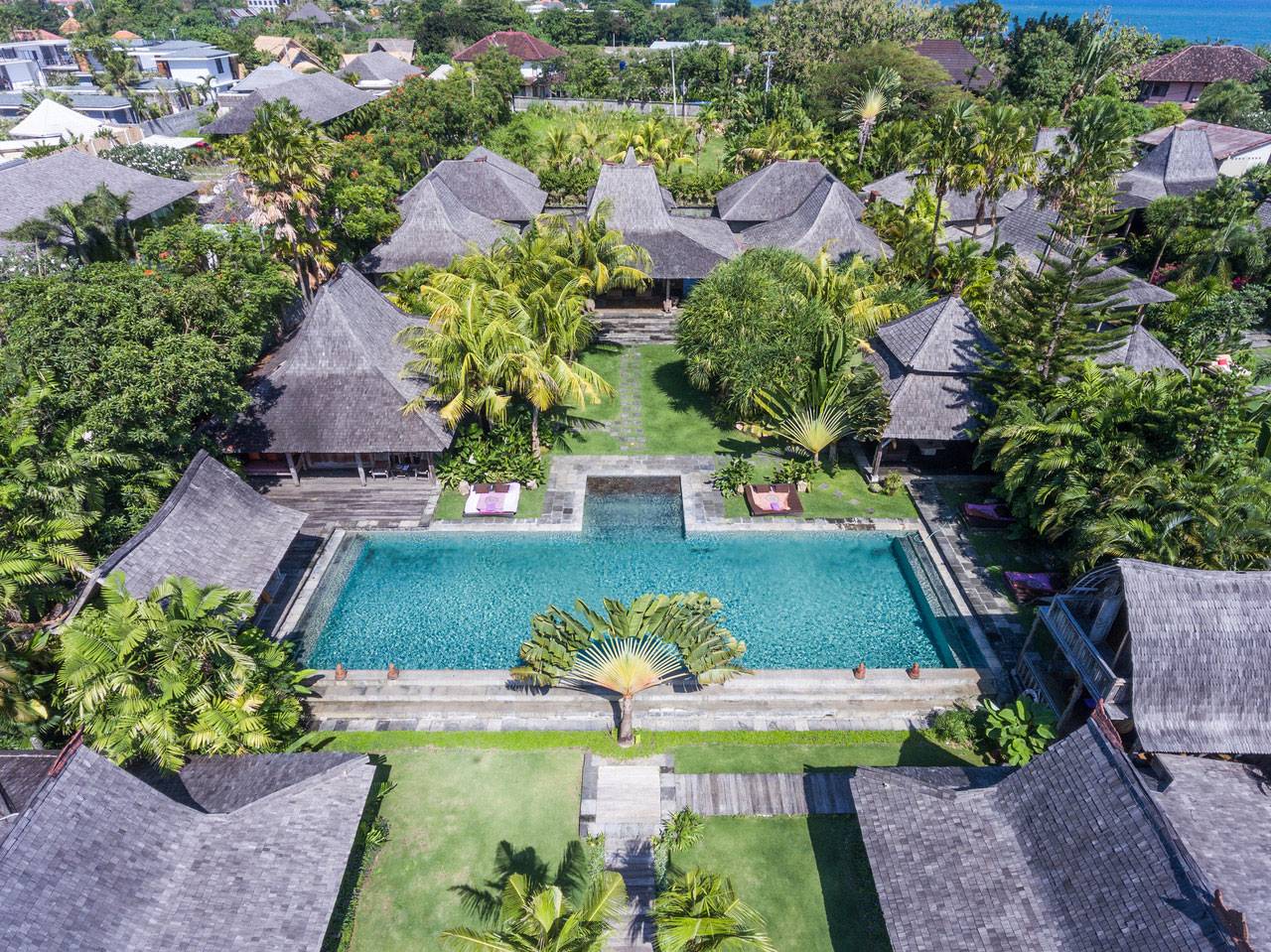 Discreetly tucked off the living room in the main villa are the three large, air-conditioned, king-sized guest bedrooms, each with a unique charm. One is multi-level, with the bed on a raised Merbau-wood platform facing the pool, and a dressing area and large garden bathroom (with twin basins, indoor and outdoor showers and a bathtub) on the lower level. The two other bedrooms ? one with a king, the other with twin beds ? look onto their own corner gardens and also have indoor/outdoor bathrooms with bathtub, shower enclosure, and twin basins.