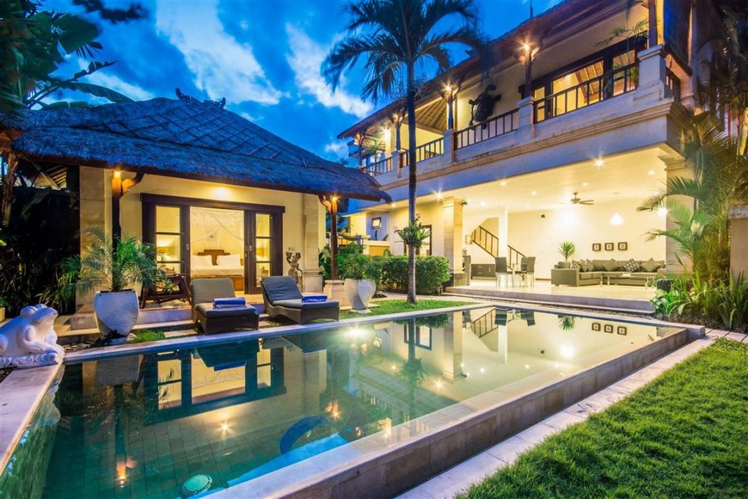 Guests are greeted at Villa 3540 by serene Balinese figures in repose before entering double doors into a spacious and bright air-conditioned lounge,