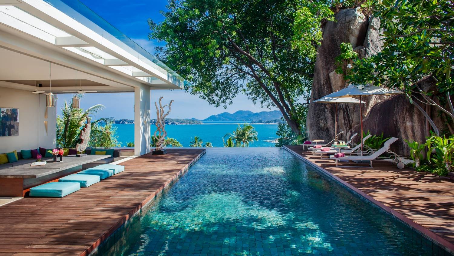 Four large en-suite bedrooms enjoy uninterrupted views over the sea. The two bedrooms on the upper level of the villa have a private terrace and outdoor Jacuzzis. Enjoy a well-equipped modern kitchen that opens up to the sunken lounge. The home cinema is equipped with a projector and large screen, a large desk with views over the sea and oversized sofas. A state-of-art Sonos music system creates the ideal atmosphere throughout the villa. Even the large infinity edge pool features underwater speakers. A large sun terrace, complete with sun beds and a BBQ area, is located beside the pool.